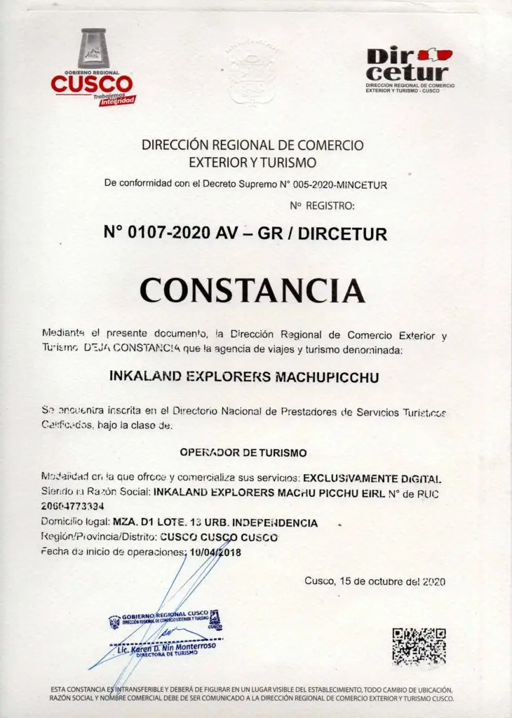 We operate with the required certifications issued by GERCETUR (Regional Directorate of Foreign Trade and Tourism of Cusco), which guarantees that our services meet all legal standards and provide travelers with confidence and security.